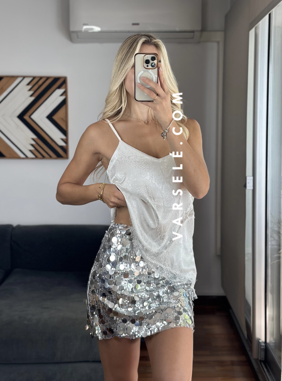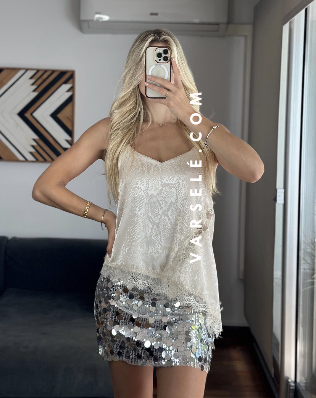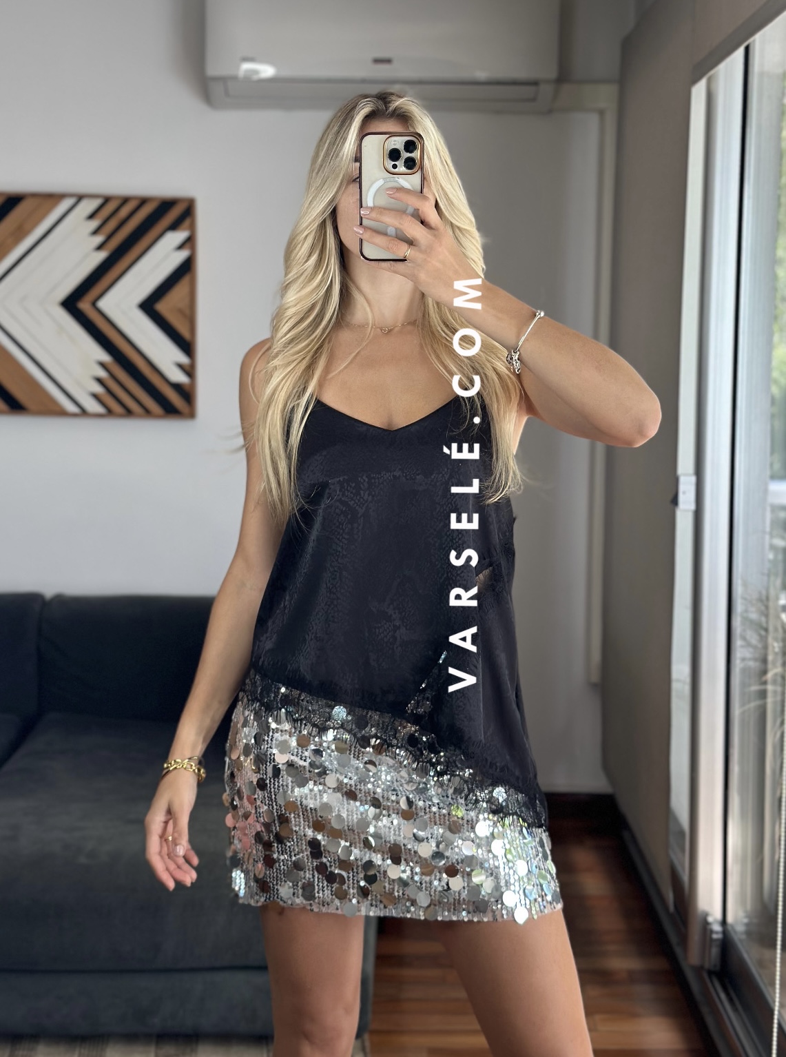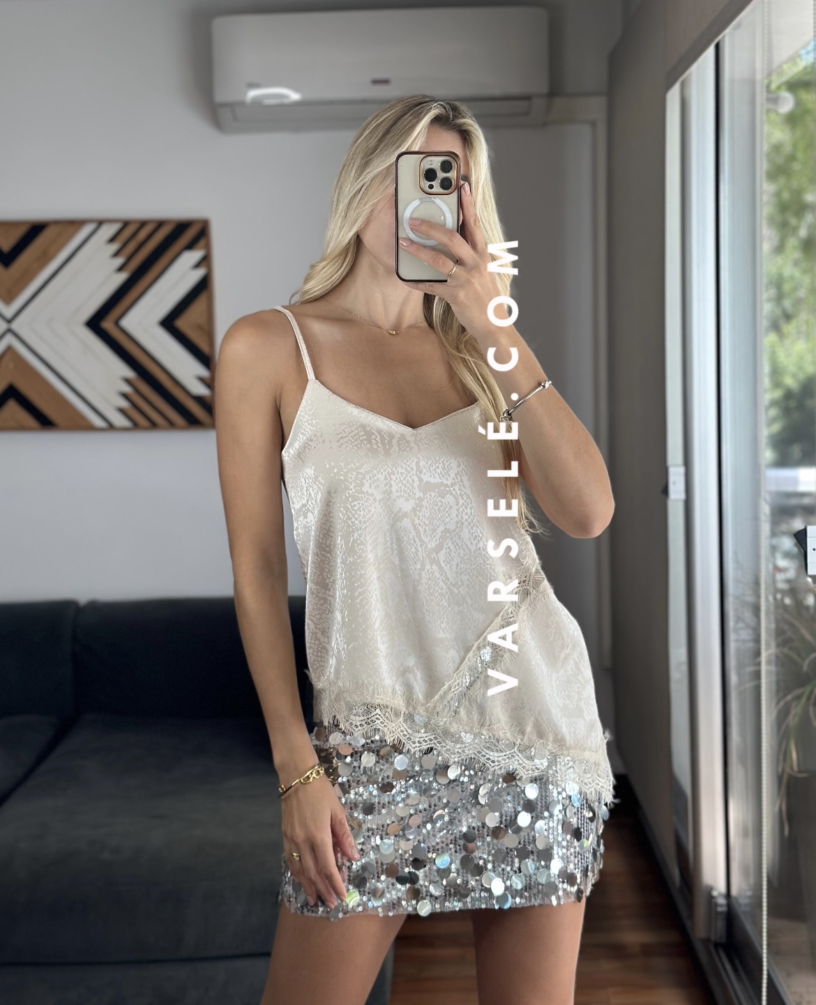 Musculosa lencera estampada de escote pico y tirantes finos. Detalle de aplicación de puntilla a tono. Bajo asimétrico.
